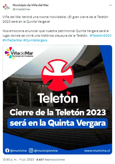 “Redoble de tambores. Estamos felices de anunciar que, por primera vez en la historia de nuestra campaña, el show de cierre de la Teletón (último bloque) lo realizaremos en una región y en el escenario más importante de Chile y Latinoamérica: la Quinta Vergara”, dispararon en Twitter para cerrar.