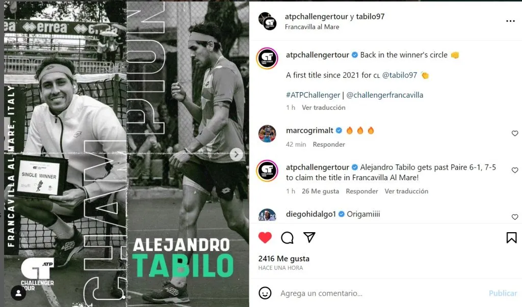 Alejandro Tabilo (190°) cerró este domingo una de las mejores semanas de su carrera y se impuso sin grandes dificultades a Benoit Paire (160°) por 6-1 y 7-5, logrando así el título del Challenger de Francavilla, en Italia, segundo trofeo de esta categoría que consigue como profesional.