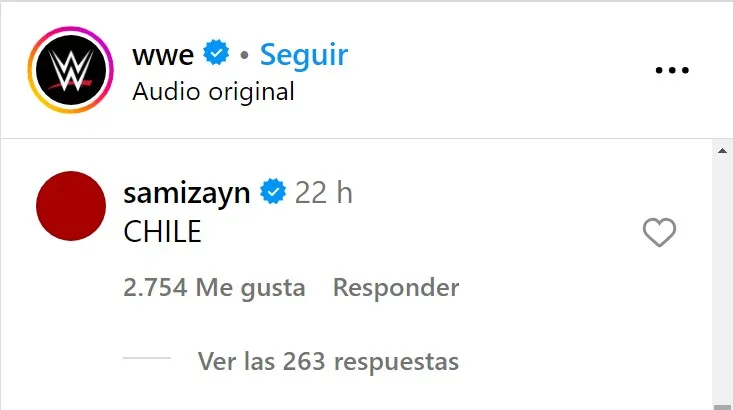 A ellos se sumó Sami Zayn, actual campeón Intercontinental, quien puso en mayúsculas la palabra “CHILE”, una señal clara de que quiere un show otra vez en nuestro país. Bastó eso para que comentarios, emojis y fotos con la banderas llenaran la publicación.