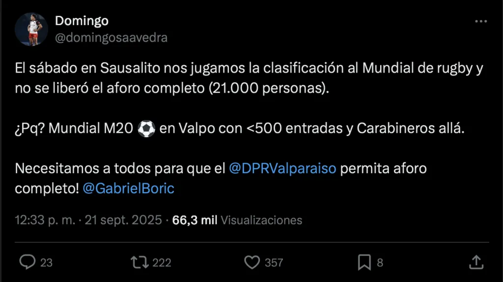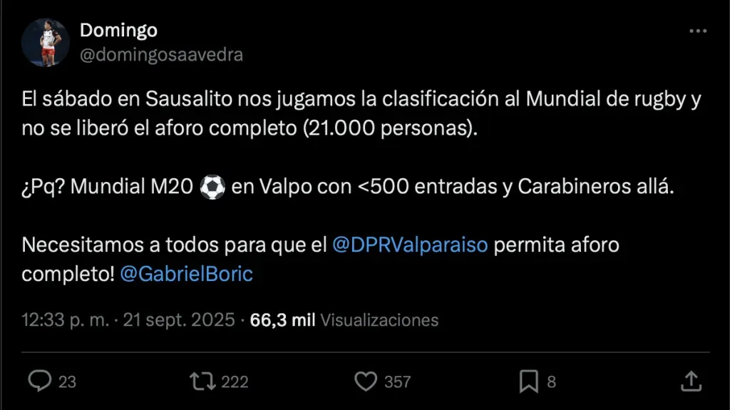 A través de su cuenta en X, el capitán de los Cóndores expresó que “nos jugamos la clasificación al Mundial de Rugby y no se liberó el aforo completo. ¿Por qué? Mundial Sub 20 en Valpo con menos de 500 entradas y Carabineros allá. ¡Necesitamos a todos!”, donde además etiquetó al Presidente Gabriel Boric.