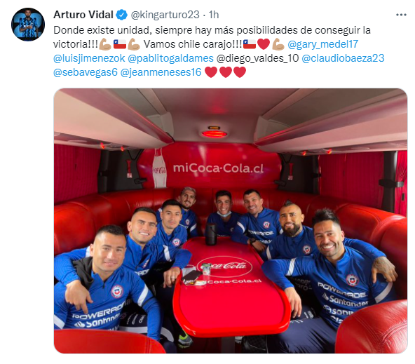 “Donde existe unidad, siempre hay más posibilidades de conseguir la victoria!!!Vamos Chile carajo”, escribió el exmediocampista del Bayer Leverkusen, Juventus, Bayern Munich y Barcelona en una clara señal del buen ánimo que existe dentro del camarín con la esperanza de sacar un gran resultado.