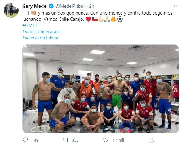 “+ 1 y más unidos que nunca, Con uno menos y contra todo seguimos luchando. Vamos Chile, carajo”, fueron las palabras de Gary Medel tomándose revancha de los rumores que lo incluían en una supuesta indisciplina de carácter grave.