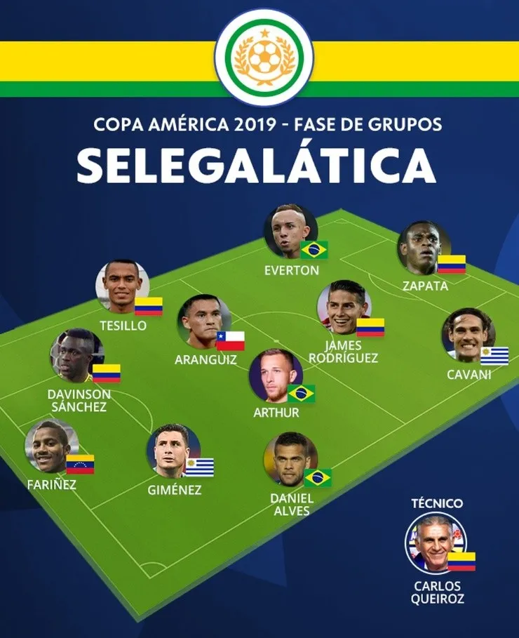 El equipo quedó integrado por Wuilker Faríñez; Dani Alves, José María Giménez, Davinson Sánchez y William Tesillo; Arthur, Aránguiz y James Rodríguez; Edinson Cavani, Duvan Zapata y el revulsivo Everton.