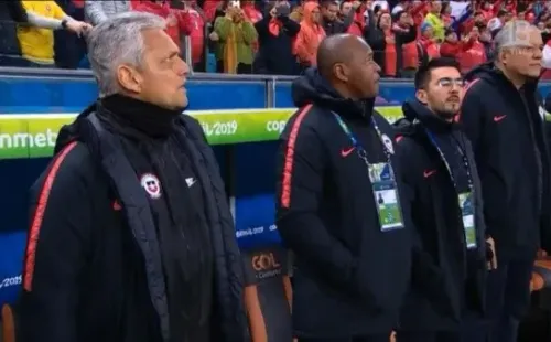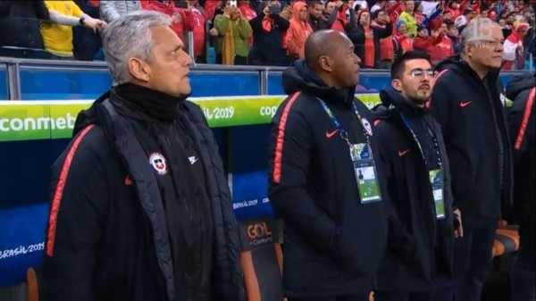 En la previa del duelo los jugadores nacionalescantaron con fuerza junto a los hinchas criollos presentes y el DT colombiano de la Roja, Reinaldo Rueda, nuevamente acompañó el canto del “Puro Chile”.