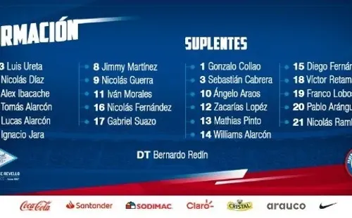 9:50 | Formación confirmada de Chile: Luis Ureta en portería; Nicolás Fernández, Lucas Alarcón, Nicolás Díaz y Alex Ibacache; Tomás Alarcón, Gabriel Suazo y Jimmy Martínez; Ignacio Jara, Iván Morales y Nicolás Guerra.