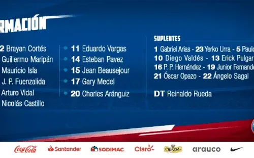 18:45 | Formación de Chile: Cortés; Isla, Maripán, Medel y Beausejour; Aránguiz, Pavez y Vidal; Fuenzalida, Castillo y Vargas