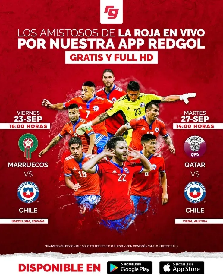 Recuerda que en Redgol podrás ver en vivo y en directo y con imagen Full HD los dos amistosos de la gira europea de la selección chilena. Este viernes 23 no te pierdas Marruecos vs Chile desde Barcelona (16:00 horas) y el próximo martes 27 a Qatar vs Chile desde Viena (14:00). Descarga la APP de Redgol en Google Play o APP Store y podrás ver ambos partidos con conexión de internet fija o wifi. También puedes ingresar directamente a Redgol.cl en territorio nacional, para seguir a la Roja del Toto Berizzo.