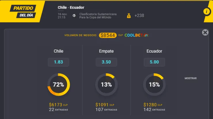 Para el OSO de Coolbet, el gran favorito para ganar en este partido de las Eliminatorias Sudamericanas al Mundial de Qatar 2022 es Chile, que paga 1,83 veces lo que juegues, por sobre los 5,00 que paga Ecuador, si crees que vencerán los ecuatorianos. Ahora, si te la juegas por el empate, paga 3,50 veces lo que apuestes.