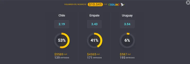 Para el OSO de Coolbet, el gran favorito para ganar este partido de las Eliminatorias Sudamericanas al Mundial de Qatar 2022 es la Selección Chilena, que paga 2.19 veces lo que juegues, por sobre los 3.54 que paga Uruguay, si crees que los charrúas se quedan con el encuentro. Ahora, si eres de quienes cree que termina en empate, paga 3.43 veces lo que apuestes.