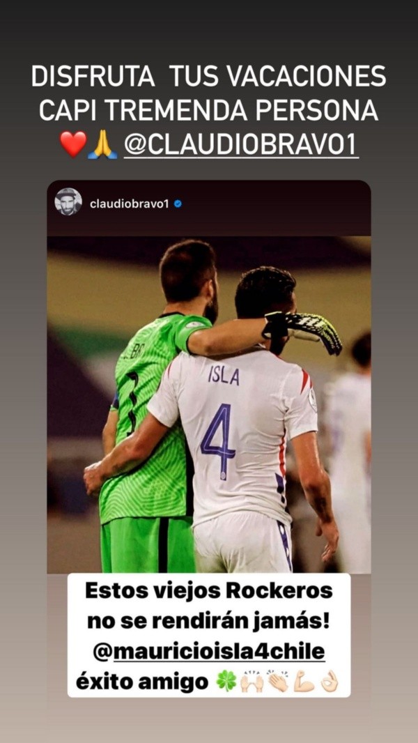 Y así lo hace sentir Claudio Bravo. El arquero de la selección chilena compartió una fotografía en redes sociales junto al Huaso y la leyenda “¡estos viejos rockeros no se rendirán jamás! Mauricio Isla, éxito amigo”.