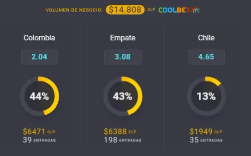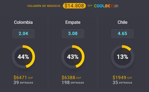 Para el OSO de Coolbet, el gran favorito para ganar en este partido de las Eliminatorias Sudamericanas al Mundial de Qatar 2022 es Colombia, que paga 2,04 veces lo que juegues por sobre los 4,65 que paga Chile, si crees que la Roja se queda con el duelo en el Metropolitano Roberto Meléndez de Barranquilla. Ahora, el empate entre ambos paga 3,08 veces lo que juegues. Además, este duelo es para el OSO el “Partido del Día”, donde si termina en empate sin goles, se considera como “aburrido”, y te devuelven la apuesta en hasta $15.000.