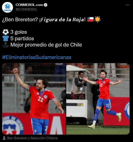 “¿Ben Brereton? ¡Figura de la Roja! 3 goles, 5 partidos y el mejor promedio de goles de Chile”, publicó el ente rector del fútbol sudamericano.