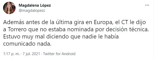 Por último, y sobre Torrero, la periodista Magdalena López contrapone laversión de la arquera: “antes de la última gira en Europa, el cuerpo técnico le dijo a Torrero que no estaba nominada por decisión técnica. Estuvo muy mal diciendo que nadie le había comunicado nada”, publicó en su cuenta de Twitter.