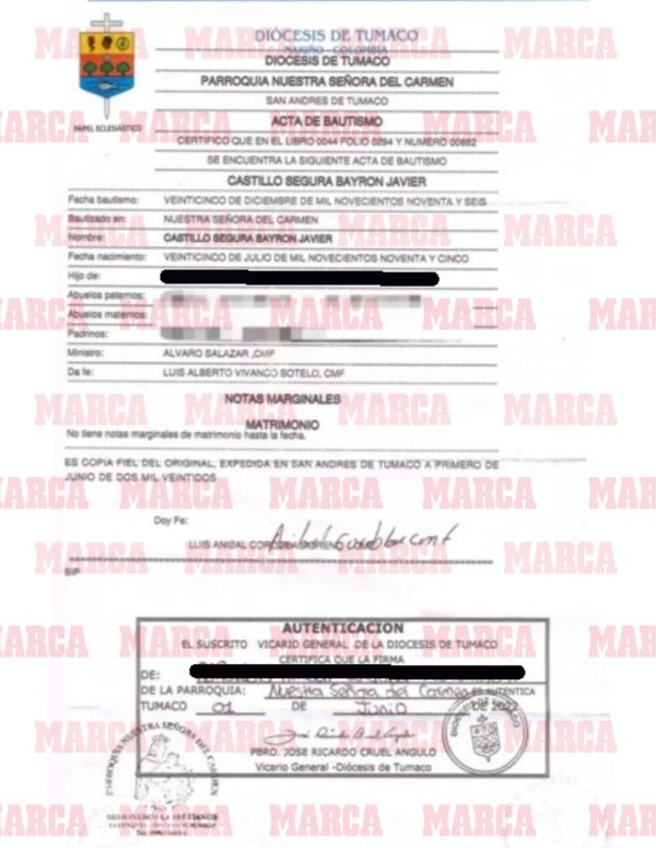 Para Marca es fundamental la presentación de la partida de nacimiento fechada el 1 de junio de 2022, que indica que Castillo fue bautizado el 25 de diciembre de 1996 en la Diócesis de Tumaco (Nariño, Colombia), documento que recoge que la ceremonia bautismal fue celebrada en la Parroquia Nuestra Señora del Carmen.