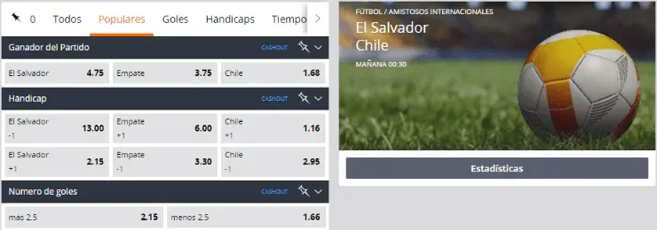 Para Betsson, el favorito para ganar este partido amistoso es Chile, que paga 1,68 veces lo que juegues, por sobre los 4,75 que paga El Salvador, si crees que serán ellos los que ganarán. Ahora, el empate entre ambos paga 3,75 veces lo que apuestesen este encuentro.