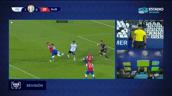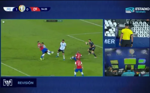 El árbitro colombiano Wilmar Roldán dudó, pero fue al monitor del VAR y cobró el penal. Desde los doce pasos Arturo Vidal falló ante la mano de Martínez y el posterior travesaño.