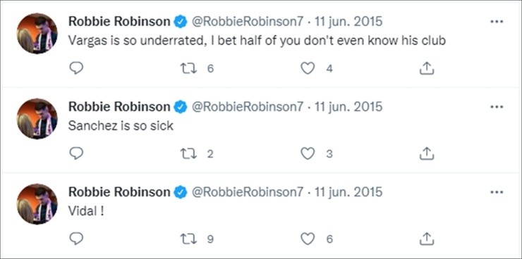 Ese día posteó imágenes del centro de Santiago lleno de hinchas, que le enviaba su tío. También retuiteó una foto de Arturo Vidal celebrando la histórica victoria en Maracaná. Y nunca más se separarían los caminos de Robinson y la Roja.