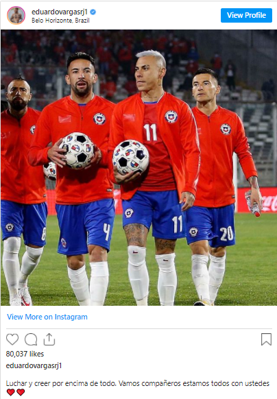 El atacante, sin embargo, sigue bastante de cerca el importante compromiso que tendrá la Roja y a través de su cuenta de Instagram mandó un mensaje de aliento a todos sus compañeros que tendrán que visitar al siempre complicado Metropolitano de Barranquilla. “Luchar y creer por encima de todo”, escribió.