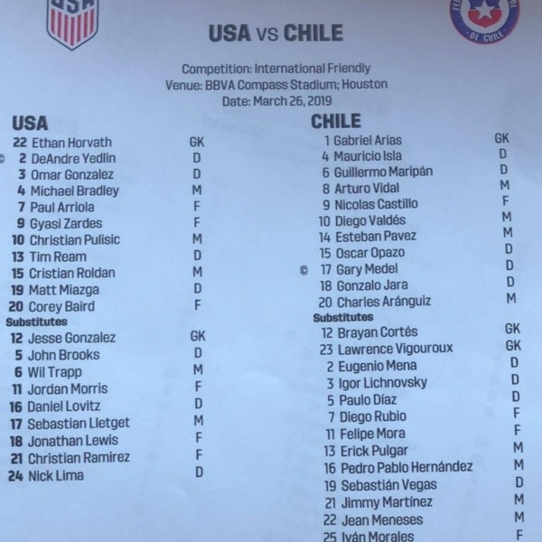 AmistosoSelección Chilena¡Estos son los 11 de Chile para enfrentar a Estados Unidos!La Roja enfrenta a Estados Unidos en su segundo amistoso en suelo norteamericano."Nunca lo he visto...": el desesperado mensaje de Vidal a OsorioPollo Véliz no se convence con la Roja de Córdova: "Así comenzó Gareca"Por Cristopher AntúnezActualizado el 26/03/2019 - 23:58hs CLTSigue a Redgol en Google! whatsapp© RODRIGO SAENZ/AGENCIAUNO, RODRIGO SAENZ/AGENCIAUNOSAN DIEGO: Mexico vs Chile - 21 de Marzo del 2019/San Diegodurante el partido de Mexico vs Chile, valido por la pen�ltima fecha Fifa, antes de la Copa America 2019, disputado en el Estadio SDCCU, de la ciudad de San Diego.FOTO: RODRIGO SAENZ /AGENCIAUNOLee tambiénChileÓscar Salinas revela que estuvo cerca de llegar a un grandeNoticiasSorpresa total en TNT Sports: confirman salida de panelistaCopa LibertadoresEstos son los silbatos que saquearán a los chilenos en LibertadoresSelección Chilena"Nunca lo he visto...": el desesperado mensaje de Vidal a OsorioCOMENTARIOS