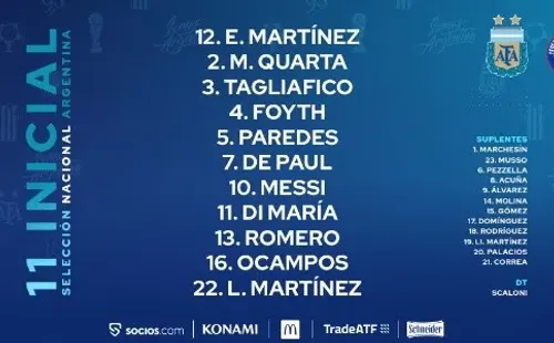 Por su parte, Argentina hará lo propio con Emiliano Dibu Martínez; Juan Marcos Foyth, Cristián Romero, Lucas Martínez Quarta y Nicolás Tagliafico; Lucas Ocampos, Leandro Paredes, Rodrigo De Paul y Ángel Di María; Lionel Messi y Lautaro Martínez.