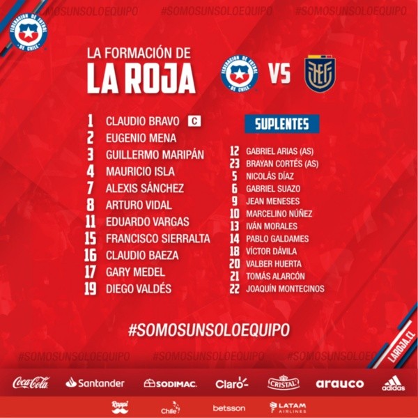 Restando poco más de una hora para el duelo, Martín Lasarte confirmó la formación. El once de Chile está integrado por Claudio Bravo en el arco; Francisco Sierralta, Gary Medel y Guillermo Maripán en defensa; Mauricio Isla, Claudio Baeza, Eugenio Mena; Arturo Vidal y Diego Valdés en el mediocampo; Alexis Sánchez y Eduardo Vargas en ataque.