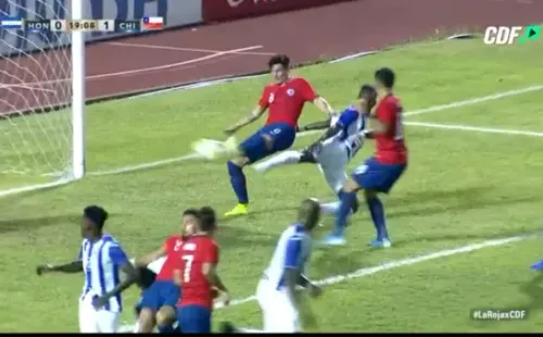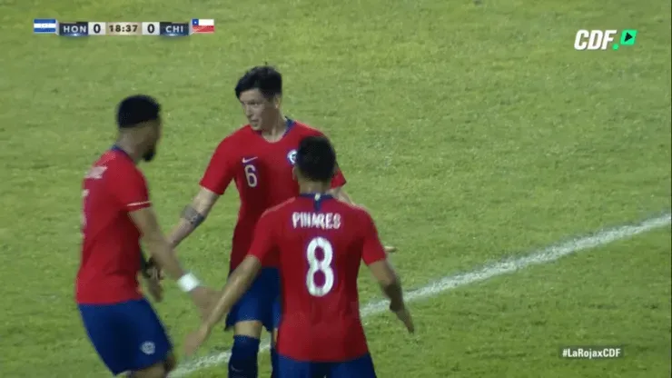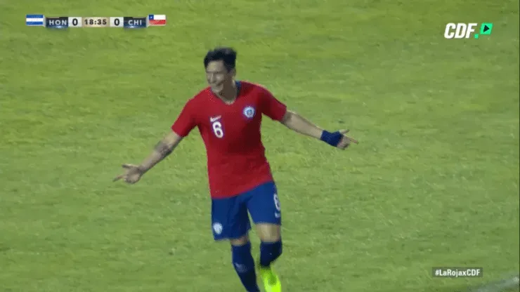 Al minuto 18′, el lateral cruzado aprovechó un pivoteo de Diego Rubio tras un córner y la empujó ante la salida del portero local. Es el primer gol del Poncho con la camiseta de la Roja. 1-0 gana Chile en San Pedro Sula.