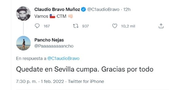 Tras el triunfo Bravo festejó con todo en redes sociales, mostrándose muy contento y sacando pecho por sus compañeros, felicitándoles por los tres puntos de oro obtenidos.