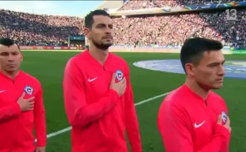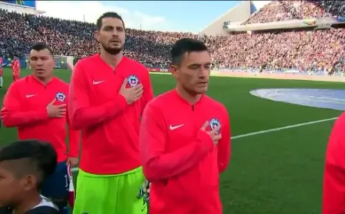 Al momento de cantar el Himno, el arquero argentino y nacionalizado criollo cantó igual o más efusivo que todos la canción nacional junto a su mano en el corazón y el escudo chileno.