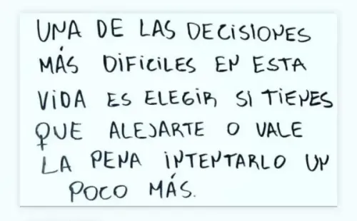 “Una de las decisiones más difíciles en esta vida es elegir si tienes que alejarte o vale la pena intentarlo un poco más”, dice la frase.