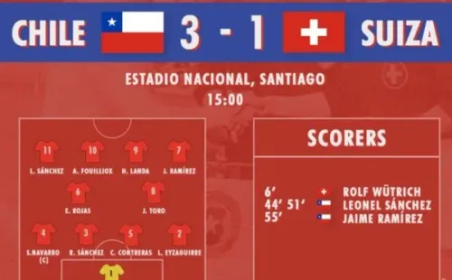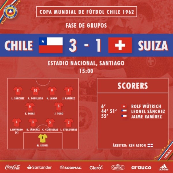 Y la Roja comenzó en desventaja: Suiza abrió la cuenta con el gol de Rolf Wüthrich en los 6’, pero antes del primer tiempo Leonel Sánchez puso el empate para la selección chilena en los 44’.