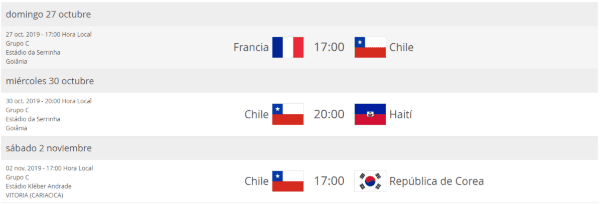 El primer encuentro para los dirigidos por Cristián Leiva será frente a Francia en el Estadio da Serrinha, en Goiania, y será a las 17:00 horas. Será la gran oportunidad de sumar puntos para encaminar la clasificación.