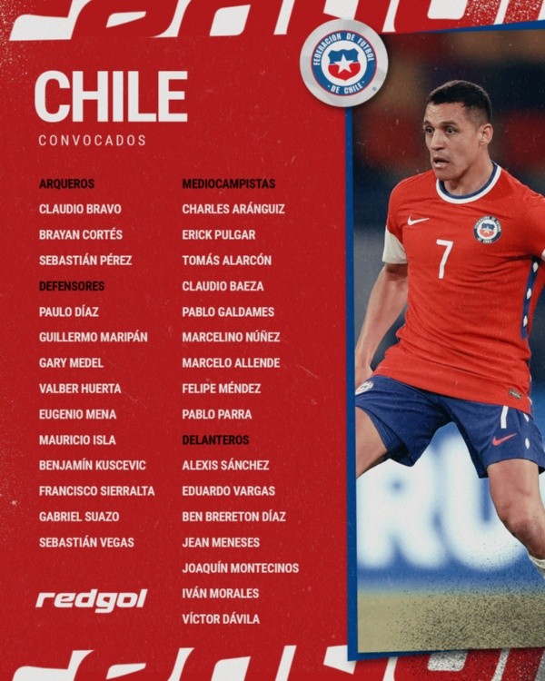 Delanteros: Alexis Sánchez, Eduardo Vargas, Ben Brereton Díaz, Jean Meneses, Joaquín Montecinos, Víctor Dávila e Iván Morales.