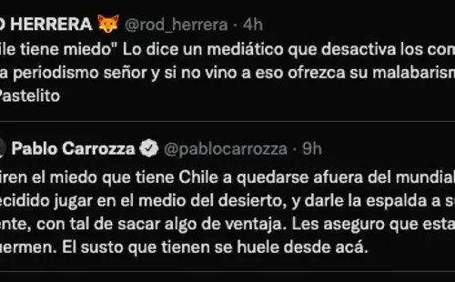 Pablo Carrozza se mostró agresivo con Chile, pero ante su cobardía de ocultar respuestas, desde nuestro país le salieron al cruce. El periodista Rodrigo Herrera no aguantó el show que montó el colega en redes sociales y lo encaró con todo.