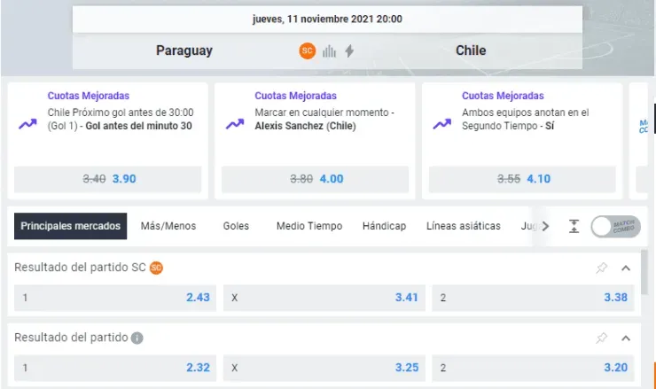 Una de las opciones atractivas de este sitio de apuestas es su característica de “2 goles de ventaja”, es decir, si apuestas a Chile y en algún momento del partido va ganando por dos goles, la apuesta se considera ganada, a pesar de que el resultado pueda variar durante el encuentro.