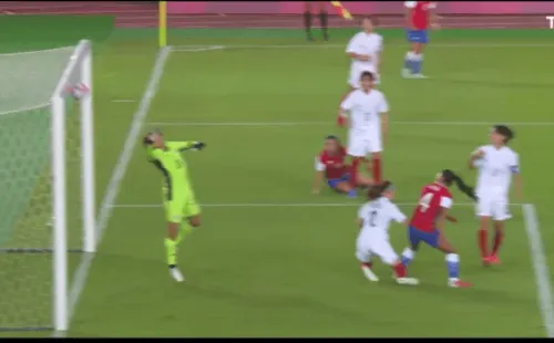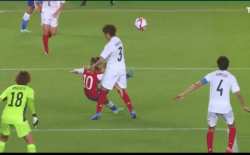 El balón no entró completamente al dar en la línea, sin embargo en su bote sube y la imagen pareciera revelar que la golera AyakaYamashita atrapa la pelota dentro de la portería.Así las cosas, sólo resta esperar que aparezca una imagen desde un mejor ángulo.