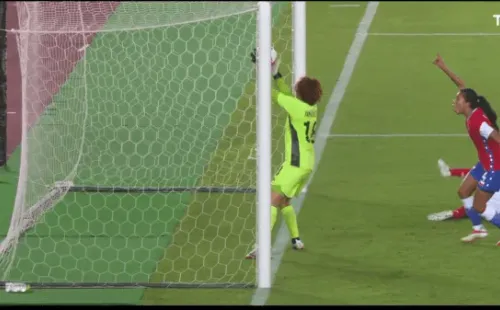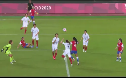 Un centro de Yanara Aedo quedó para el cabezazo de Francisca Lara, la Pancha cabeceó para dejar sin opciones a la arquera japonesa y tras el palo horizontal el balón bajó para dar en la línea al límite. En su bote, la pelota deja muchas dudas.
