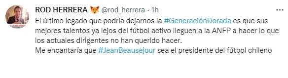 Algo que puede definir los nuevos lineamientos del fútbol chileno, donde el periodista de Redgol en La Clave, Rodrigo Herrera es claro en el mensaje que quiere: “El último legado que podría dejarnos la generación dorada es que sus mejores talentos, ya lejos del fútbol activo, lleguen a la ANFP a hacer lo que los actuales dirigentes no han querido hacer. Me encantaría que Jean Beausejour sea el presidente del fútbol chileno”, comentó en su Twitter.