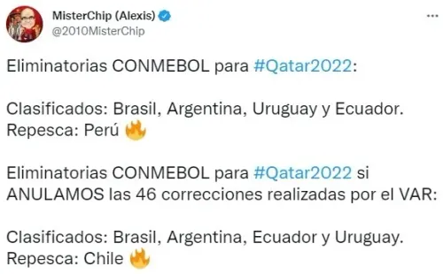 “Eliminatorias CONMEBOL para #Qatar2022 si ANULAMOS las 46 correcciones realizadas por el VAR: Clasificados: Brasil, Argentina, Ecuador y Uruguay. Repesca: Chile”.