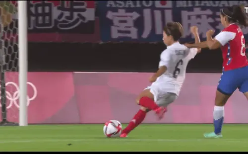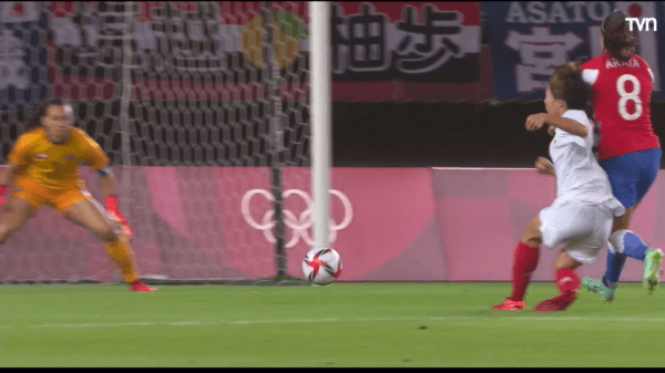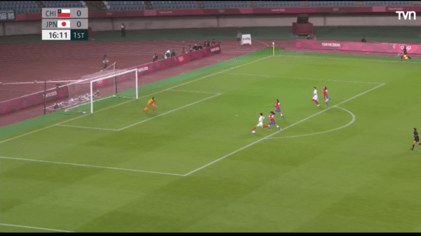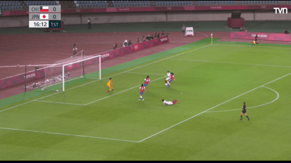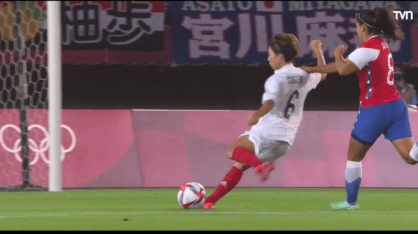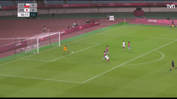 A los 16 minutos Hina Sugita recibió un balón entre líneas, entró en área y salió un zurdazo cruzado que hubiera sido gol de no mediar el tapadón de Tiane Enlde, que evitó la conquista de las locales con la pierna.