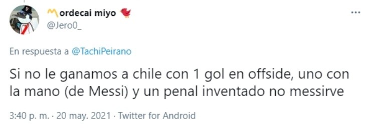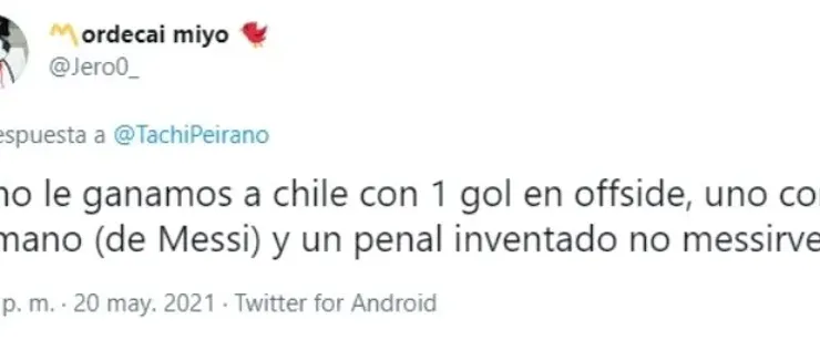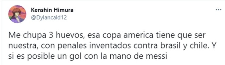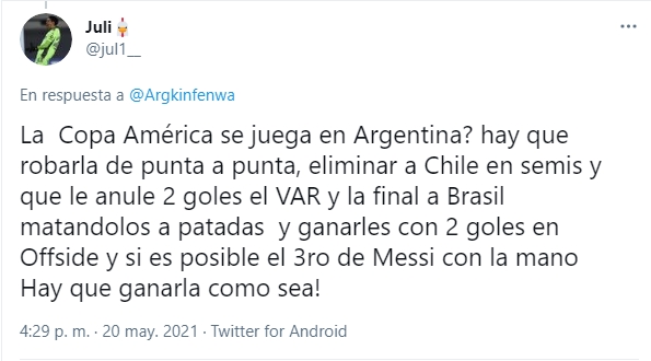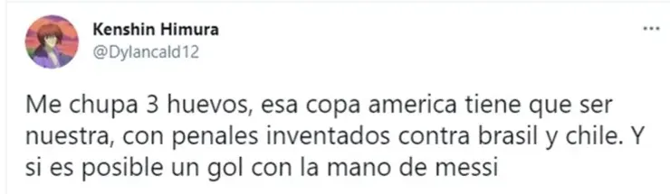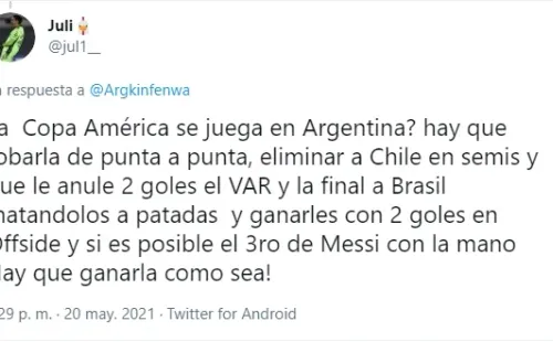 Algunos fueron más allá. “Ojalá robemos todos los partidos. Es más, quiero cruzarme con Chile y que nos den tres penales inexistentes”, dice @joaqu74. “Hay que robarla de punta a punta, eliminar a Chile en semis y que el VAR le anule dos goles”, clama @jul1_.