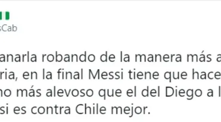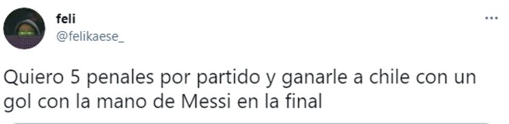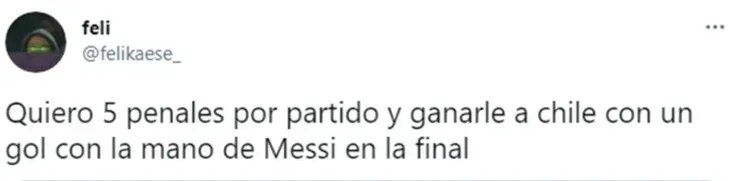 @Felikaese_ repite la apuesta y sentencia su deseo de que haya “cinco penales por partido y ganarle a Chile con un gol de Messi con la mano en la final”. “Hay que robarla ganando de la manera más asquerosa de la historia”, invita @BlaasCab.