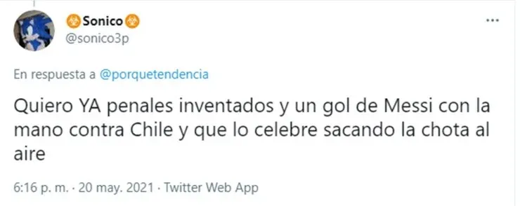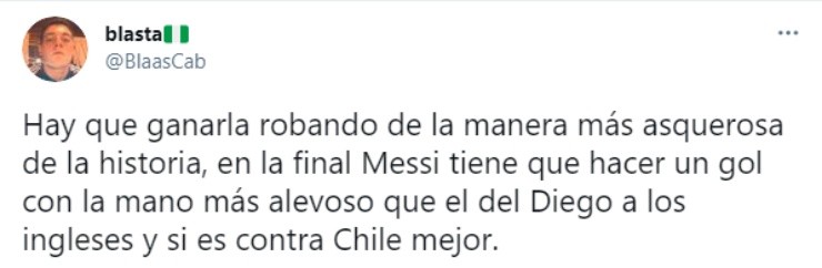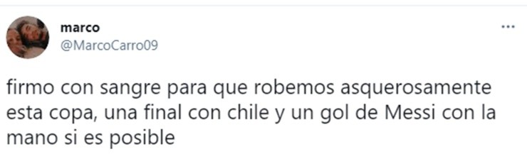 “Quiero ya penales inventados y un gol de Messi con la mano contra Chile”, pide @sonico3p, mientras que @MarcoCarro09 firma “con sangre para que robemos asquerosamente esta copa, una final con Chile y un gol de Messi con la mano si es posible”.
