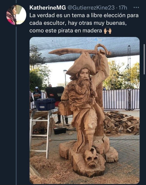 “La verdad es un tema a libre elección para cada escultor, hay otras muy buenas, como este pirata en madera”, respondió en el mensaje inicial Ketherine (@GutierrezKine23), quien acompañó otra de las obras que están en el lugar.