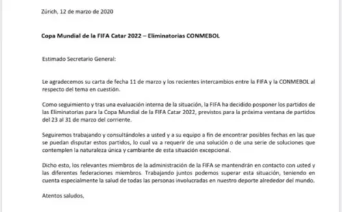 “Tras una evaluación de la situación, la FIFA ha decidido posponer los partidos de las eliminatorias para la Copa Mundial de la FIFA Catar 2022, previstos para la próxima ventana de partidos del 23 al 31 de marzo del corriente”, reza la carta firmada por la secretaria general, Fatma Samoura.