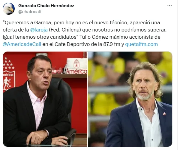 “Queremos a Gareca, pero hoy no es el nuevo técnico, apareció una oferta de la Roja que nosotros no podríamos superar. Igual tenemos otros candidatos”, comentó Tulio Gómez en el programa colombiano Café Deportivo.