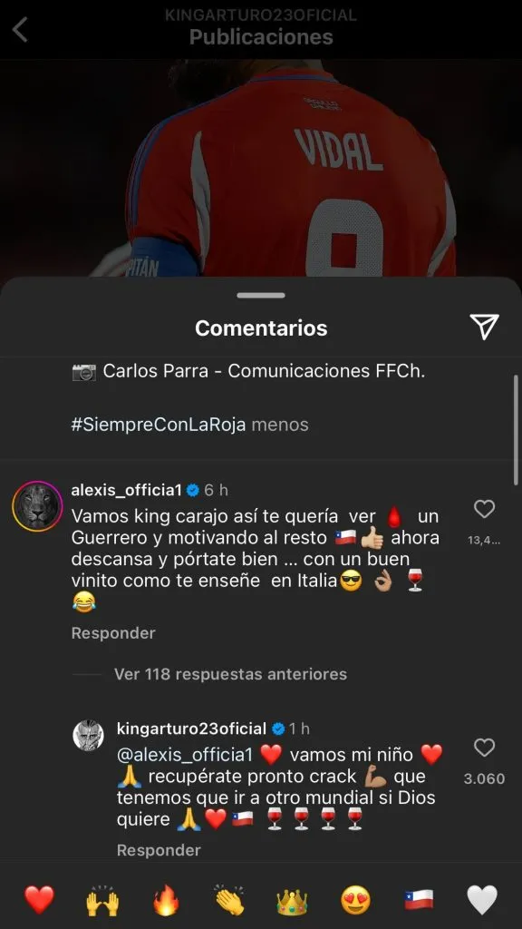 “Vamos King, carajo. Así te quería ver, un guerrero y motivando al resto. Ahora descansa y pórtate bien… con un buen vinito como te enseñé en Italia”, escribió Alexis en los comentarios.