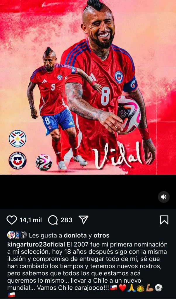 “El 2007 fue mi primera nominación a mi selección, hoy 18 años después sigo con la misma ilusión y compromiso de entregar todo de mi, sé que han cambiado los tiempos y tenemos nuevos rostros, pero sabemos que todos los que estamos acá queremos lo mismo… llevar a Chile a un nuevo mundial… Vamos Chile carajoooo!!”, destacó.