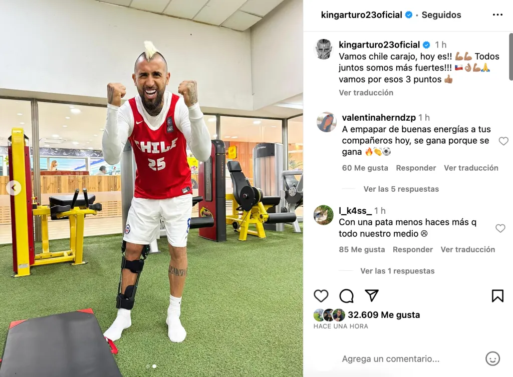 El King envió una potente arenga para todos sus compañeros, aprovechando las imágenes. “Vamos Chile carajo, hoy es!! Todos juntos somos más fuertes!!! Vamos por esos 3 puntos”, escribió el mediocampista.