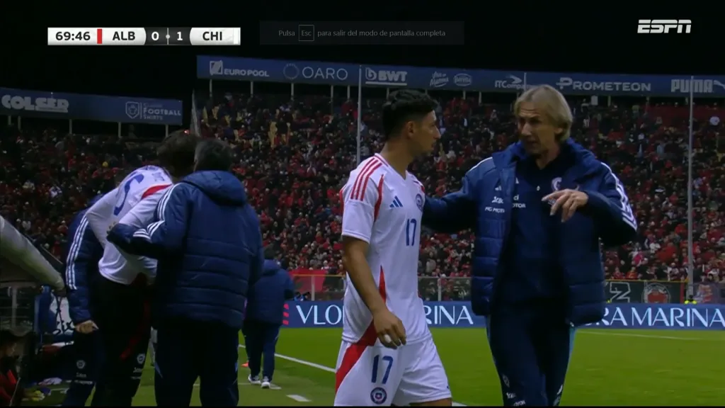 También hubo momentos para hablar con su ayudante, Sergio Santín. Y cuando el cronómetro marcaba 70′. movió la pizarra por primera vez. Mandó a la cancha a César Pérez, quien entró por el acalambrado Marcelino Núñez. Y también a Ben Brereton, quien reemplazó a Eduardo Vargas tras su retorno goleador.