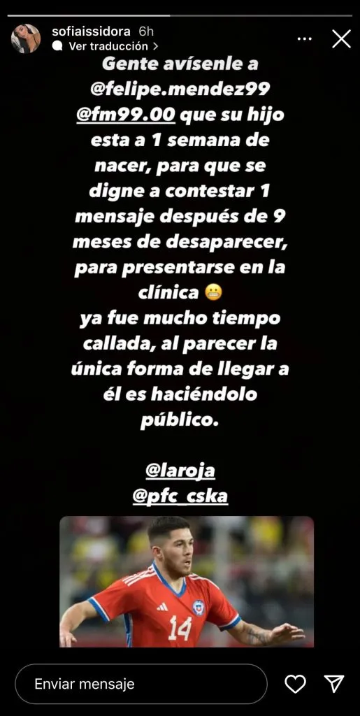 “Gente, avísenle a Víctor Felipe Méndez que su hijo está a una semana de nacer, para que se digne a contestar un mensaje después de nueve meses de desaparecer, para que se presente en la clínica. Ya fue mucho tiempo callada. Al parecer la única forma de llegar a él es haciéndolo público”, subió en su Instagram.